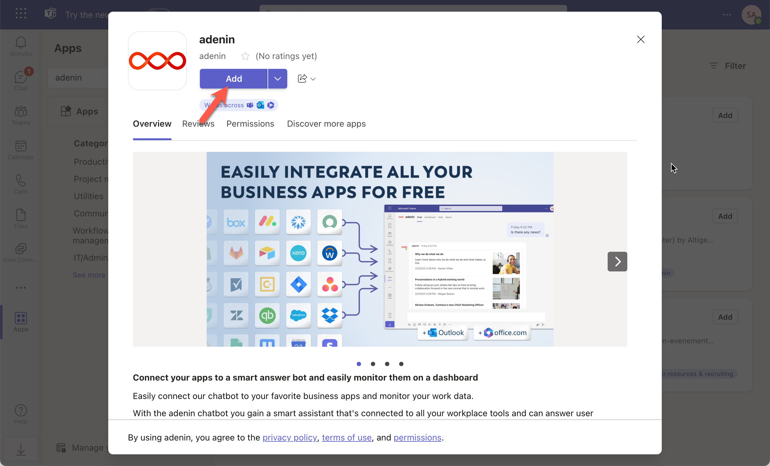 Simply follow the Add to Teams button to open the adenin app in Microsoft Teams. Click Add to add it to your Teams account.